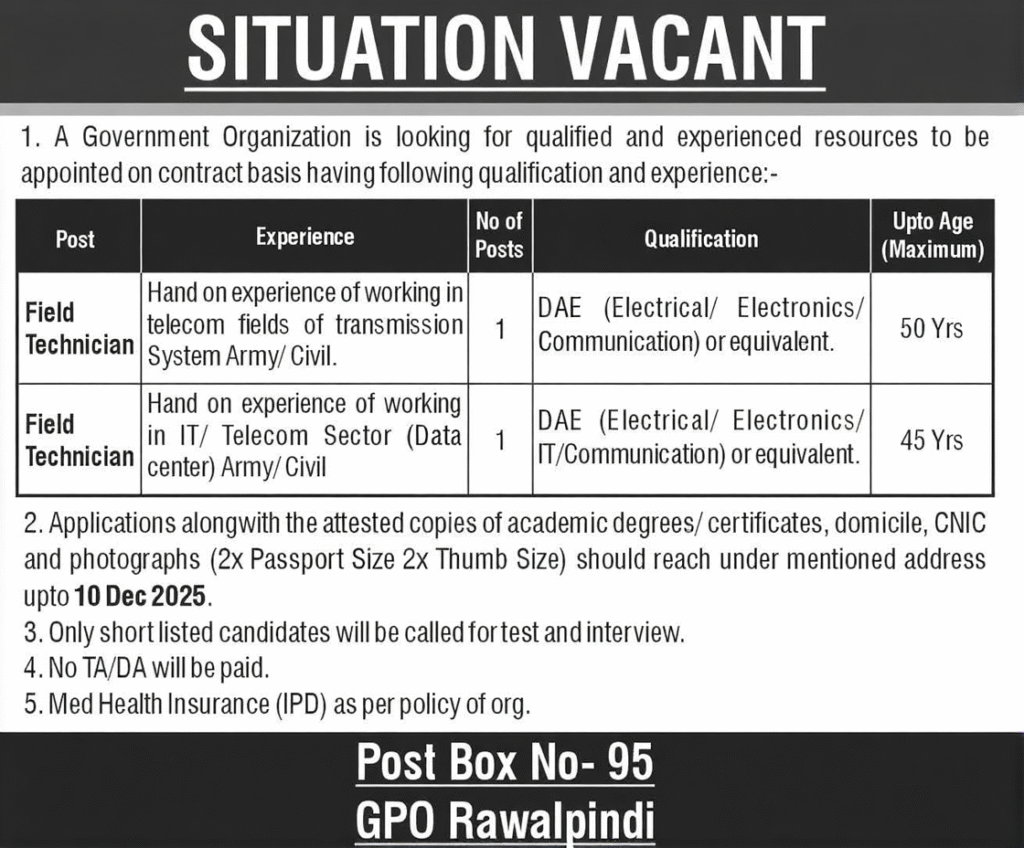 Be sure your application is inclusive of all necessary documents and photographs, and send it to Post Box No-95, GPO Rawalpindi, not later than 10th December 2025. Grab this opportunity to work with the government in the telecom and IT sectors!