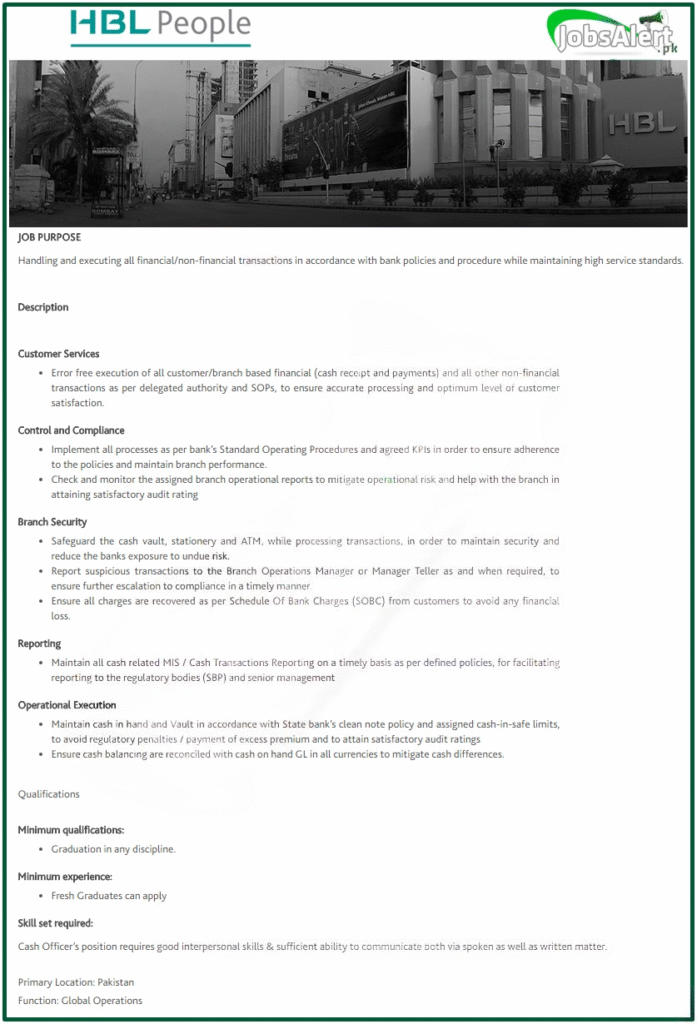 HBL is one of Pakistan’s oldest and most trusted commercial banks. With branches across the country and a global presence, HBL offers a solid platform for banking professionals to build their future. The Cash Officer role is an entry point to climb the ranks in operations, finance, or even international banking positions within HBL.