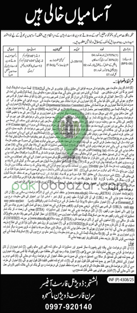 The Forest Department Khyber Pakhtunkhwa has announced new job vacancies for the position of Forest Guard (BPS-08) under the Siran Forest Division, Mansehra. The Advertisement was published in the month of October 2025, and applications are invited from suitable and fit candidates from the districts of the Siran Forest Division.