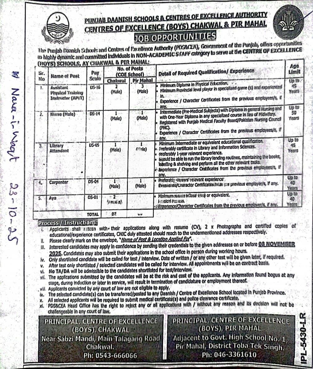 Punjab Daanish Schools & Centres of Excellence Authority Jobs 2025 for Chalwal & Pir Mahal campuses provide an excellent opportunity to join a reputable institution serving the youth of Punjab.