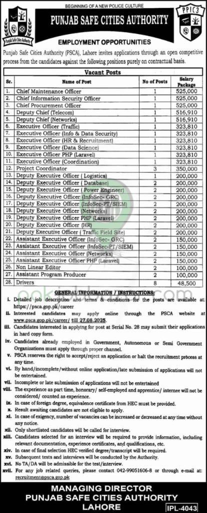 With competitive salaries, modern work environments, and a clear vision for public safety, PSCA stands as one of the most attractive employers in the public sector today. Interested candidates should seize this chance to become part of Punjab’s transformation journey before the August 27, 2025, deadline.