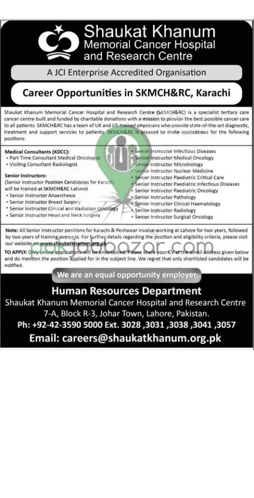 Karachi, Pakistan – The renowned Shaukat Khanum Memorial Cancer Hospital & Research Centre (SKMCH&RC), a JCI-accredited healthcare institution and Pakistan’s leading cancer treatment facility, has announced fresh job openings for multiple consultant and instructor-level positions at its Karachi branch.