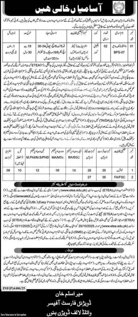 The applicants must fulfill all the conditions set by the Khyber Pakhtunkhwa Wildlife Department and ETEA.